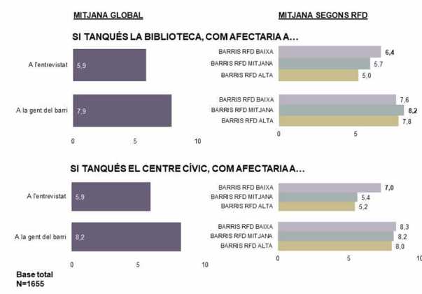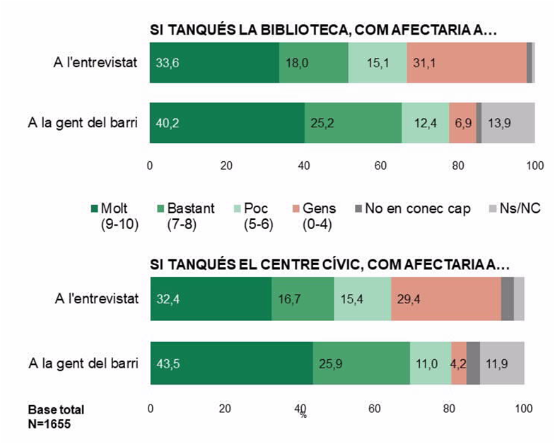 Com es pot observar al gràfic, el tancament de biblioteques i centres cívics afectaria (o millor dit, està afectant) bona part de la població. Les persones reconeixen el valor d’aquests equipaments per a la seva vida, però encara més quan se’ls pregunta en relació a la importància per al conjunt del barri. Les biblioteques i centres cívics tenen molts reptes pendents, però també l’evidència del seu valor públic.